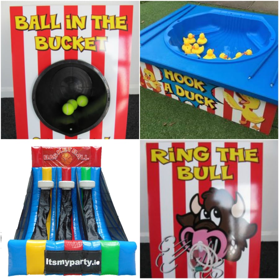 This fun fair package brings all those favourite funfair games direct to your party or event. This package includes the triple hoop basketball game, Ring the Bull, Higher or Lower, Ball in Bucket and Hook a Duck. Perfect for birthday parties, weddings and corporate staff days