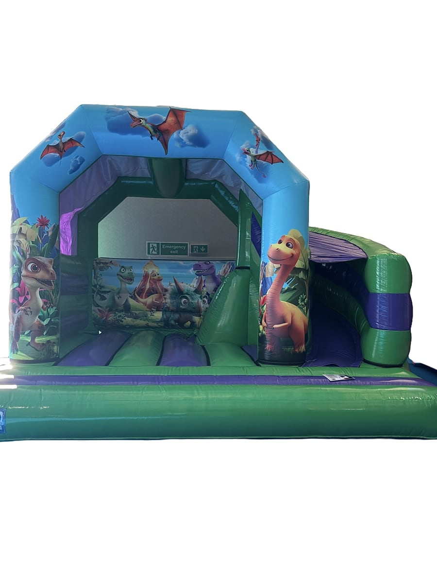 The play n slide bouncy castle is a great bouncy castle with a slide. This play n slide features a bounce area, easy access steps up to the platform and curved slide. This bouncy castle with slide has a rain cover and safety step. The Dinosaur theme features neutral green and purple colour artwork, this bouncy castle with slide is ideal for boys and girls.