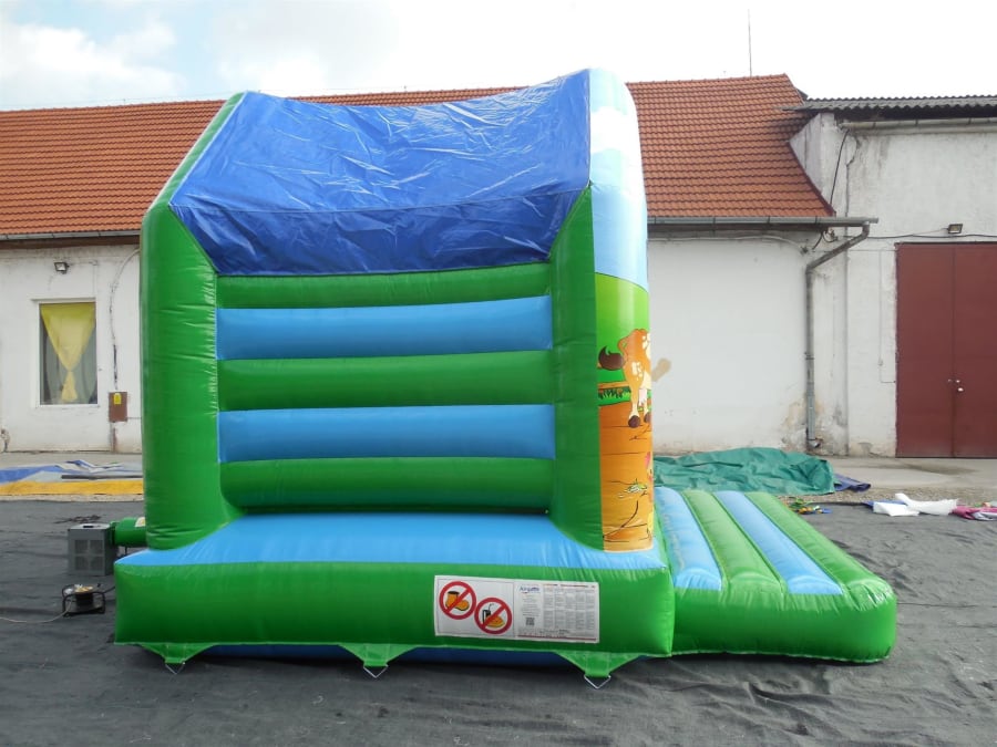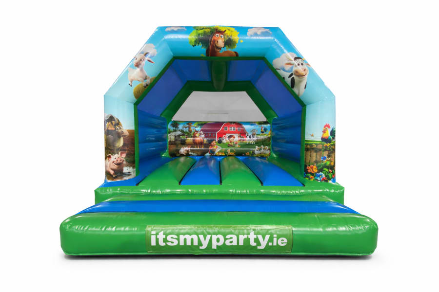 This large bouncy castle offers a spacious bounce area and colourful theme. The farmyard theme with the addition of cows, hens, dogs and sheep looks great whether in a town or country setting. This is a great bouncy castle for most age groups and suits boys and girls.