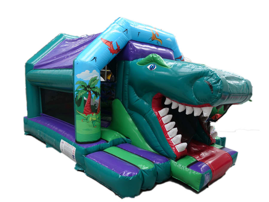 A great bouncy castle for any Jurassic park fan featuring a 3D Dinosaur complete with teeth as the front slide. This bouncy castle has a fully covered bounce area, easy climbable steps and slide. Colourful artwork that will set the scene for a T-rexcellent dinosaur party. This dinosaur design in green, blue and purple is great for boys and girls. Measuring approx. 14ft wide, this bouncy castle is ideal for narrow gardens.