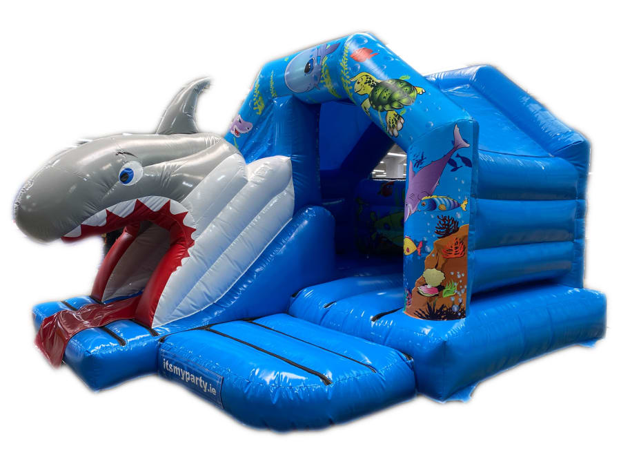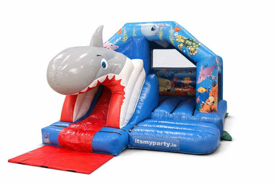The 3D Shark bouncy castle is a great bouncy castle for any Jaws fan featuring a 3D shark complete with teeth as the front slide. This bouncy castle has a fully covered bounce area, easy climbable steps and slide. The front features a 3 dimensional shark with teeth and the colourful artwork that will set the scene for an under the sea party. This shark design in green, blue and purple is great for boys and girls. Measuring approx. 14ft wide, this bouncy castle is ideal for narrow gardens.