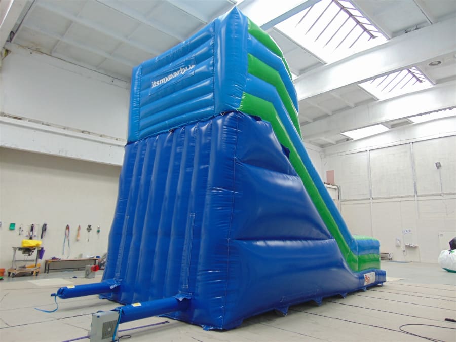 This mega bouncy castle slide will keep children entertained for hours. They can run up the steps on one side, come around the platform at the top, complete with rain/ safety cover and slide down to the bottom. The colours are popular with most children and the simple bold design makes this inflatable slide visually impressive.