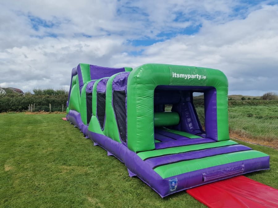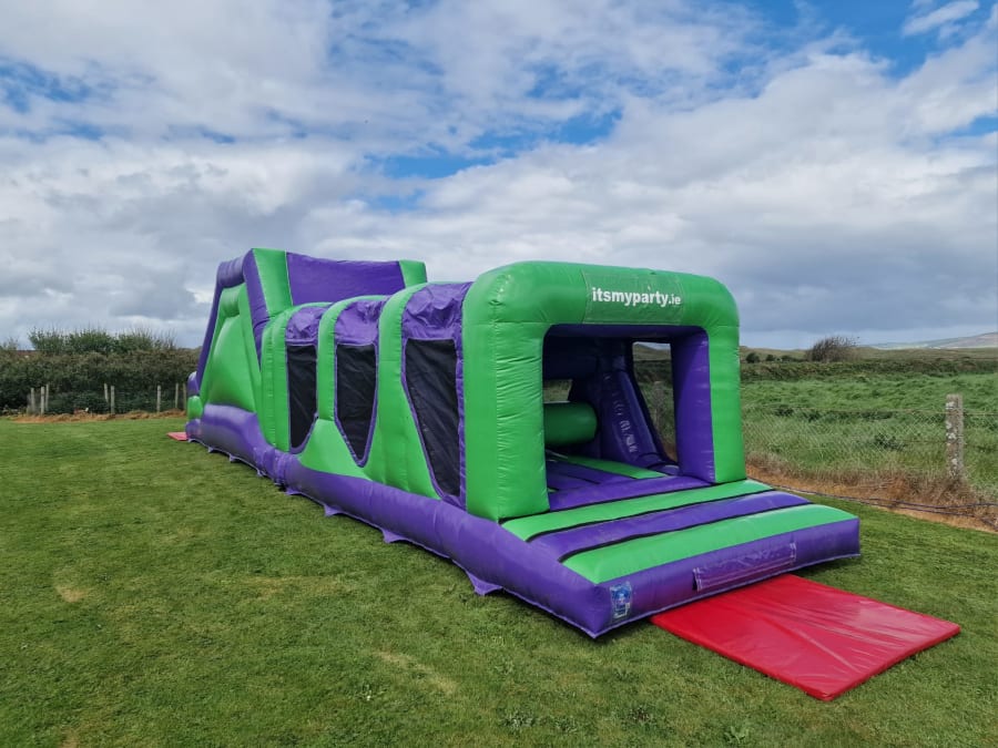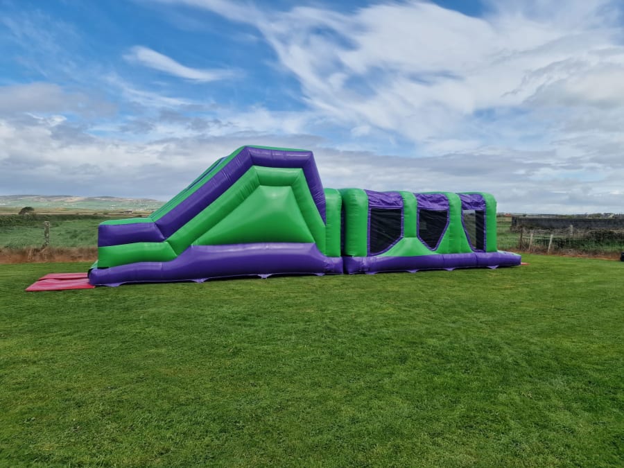 This brand new obstacle course is the latest addition to our very popular range of obstacle courses. Featuring a bright purple and green colour theme this obstacle course is ideal for boys and girls. Measuring 45ft long and filled with obstacles and a large slide at the end, it is sure to be big hit at any party or event!