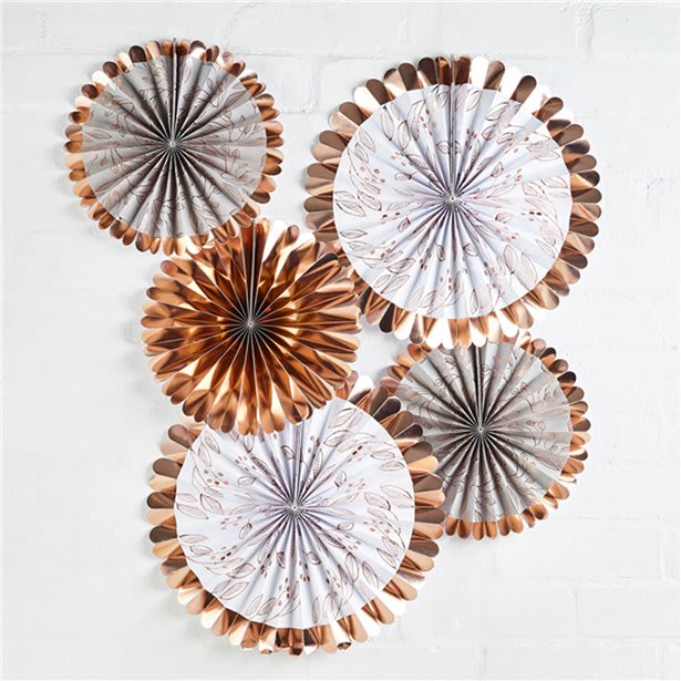 Rose gold fan decorations including 2 x large fans and 3 x small fans. Fans feature rose gold foil and decorative centres. These are ideal party decor for a birthday party, communion, confirmation or christening.
